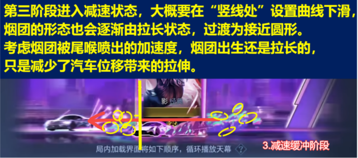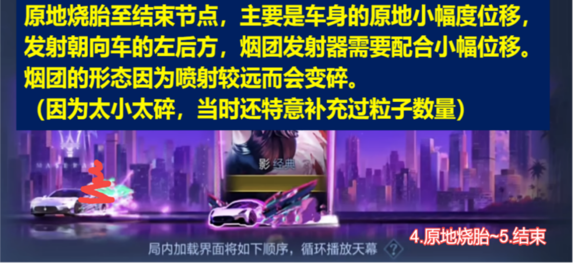 [1车尾怼屏幕喷烟雾]→[2加速位移]→[3减速至刹停]→[4原地烧胎]→[5停止运动]