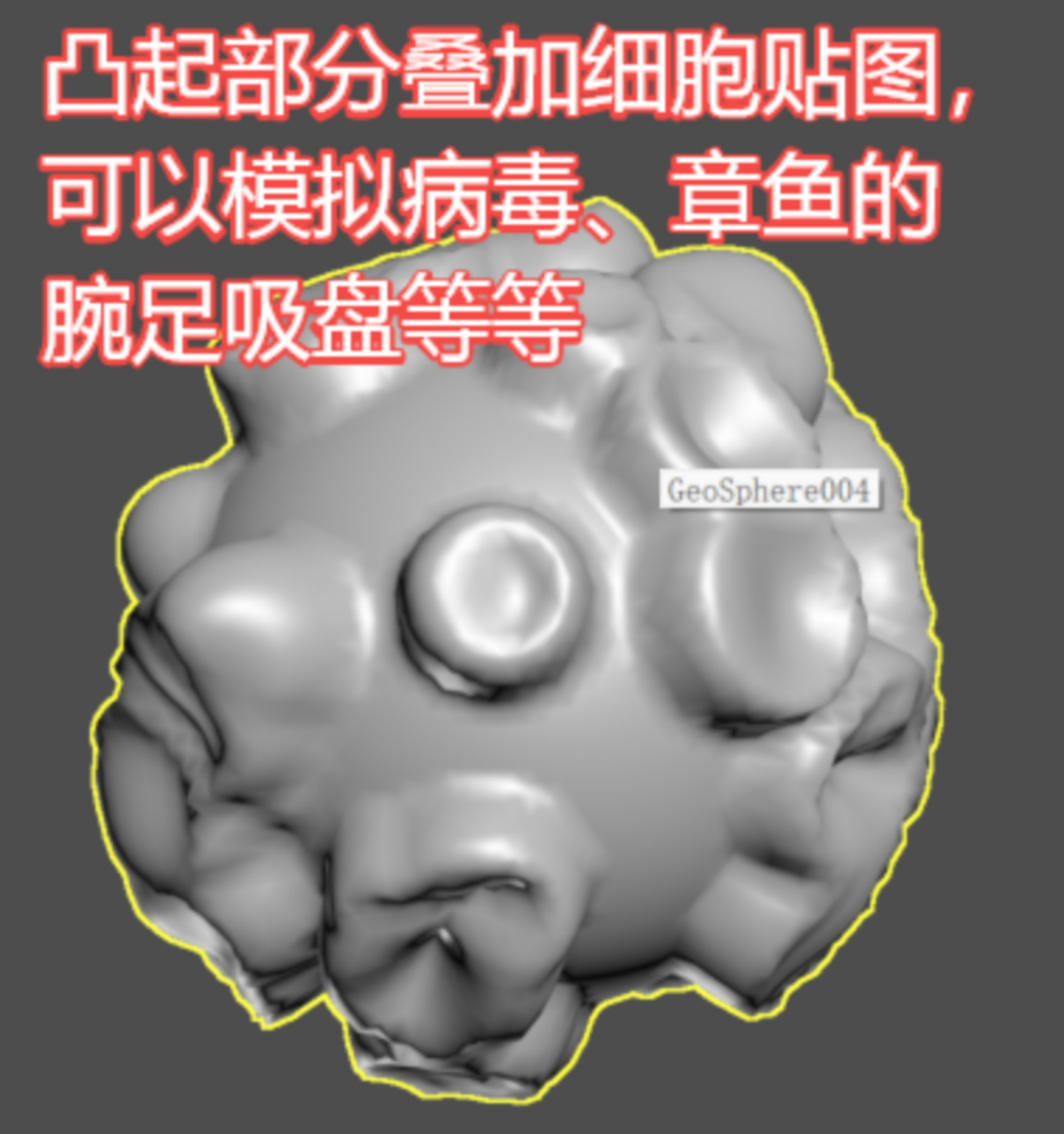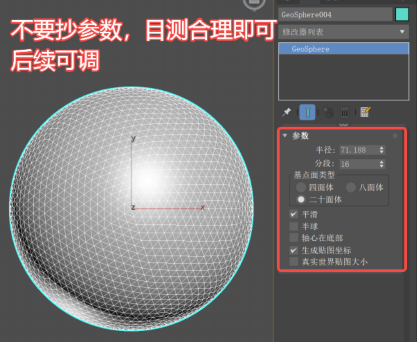 (这里务必选用几何球体“GeoSphere”,它的默认布线均匀,达到相同的平滑度用它更节省资源。)