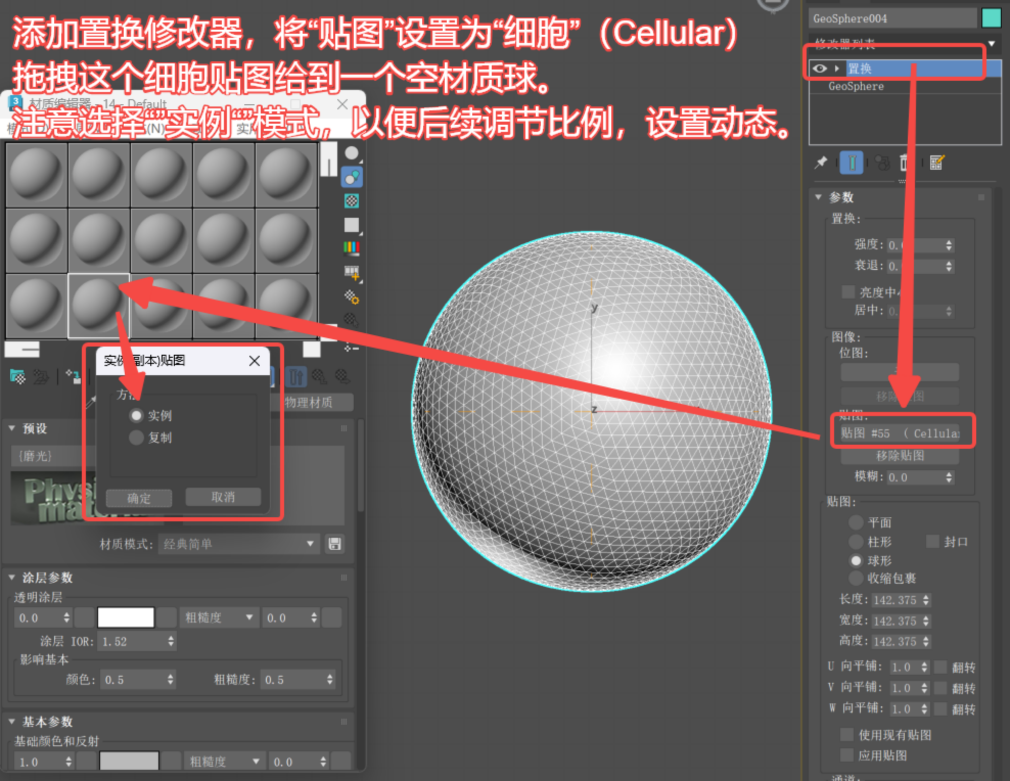 2.增加“置换”修改器,设置“细胞贴图”