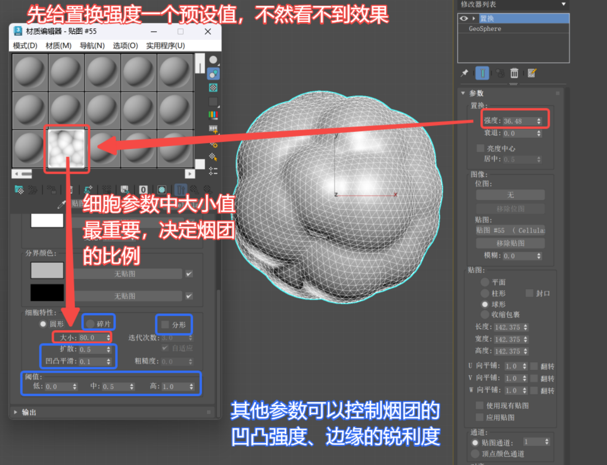 3.调节置换强度、细胞纹理比例。