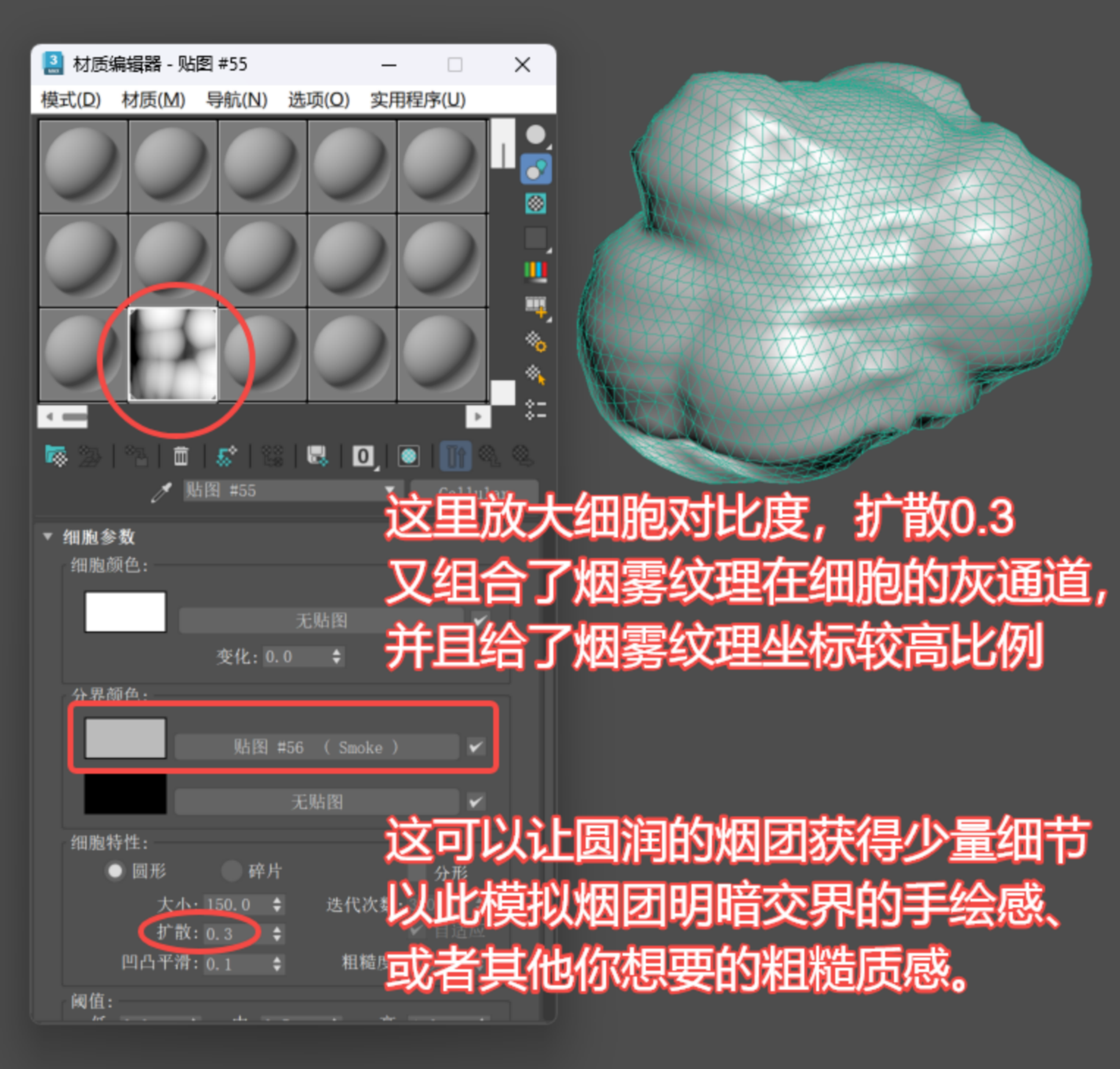 4.关于造型:叠加细胞贴图最优,但Max原生的噪波(Nosie)、烟雾(Smoke)都可以组合尝试,来适应不同的手绘特性。比如:可以得到“软中带硬““粗中有细”的造型”——