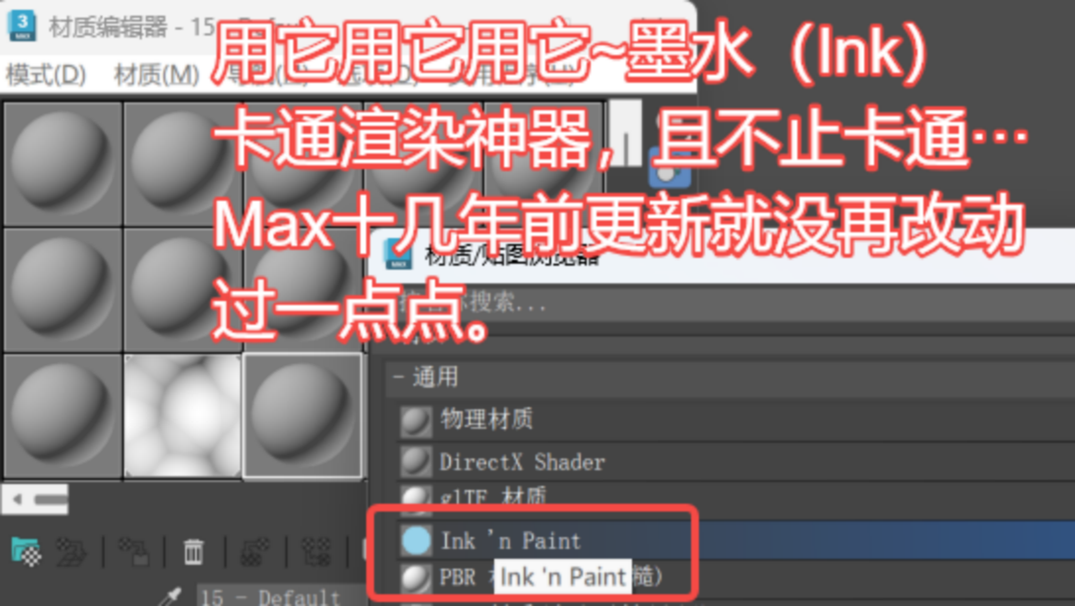 设置材质:“墨水(Ink)”材质,我们的老朋友。不用特殊渲染器,默认线扫描即可玩转。