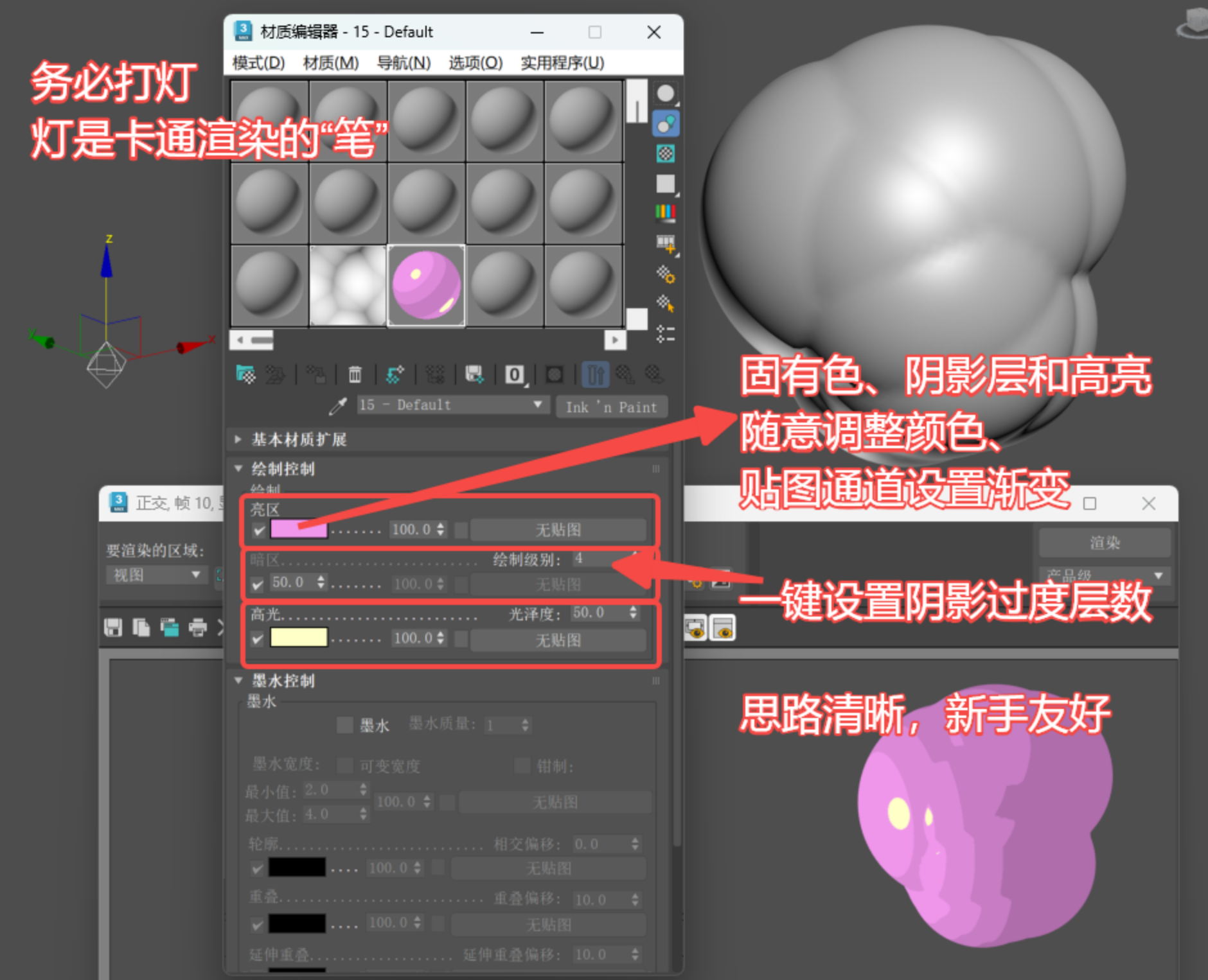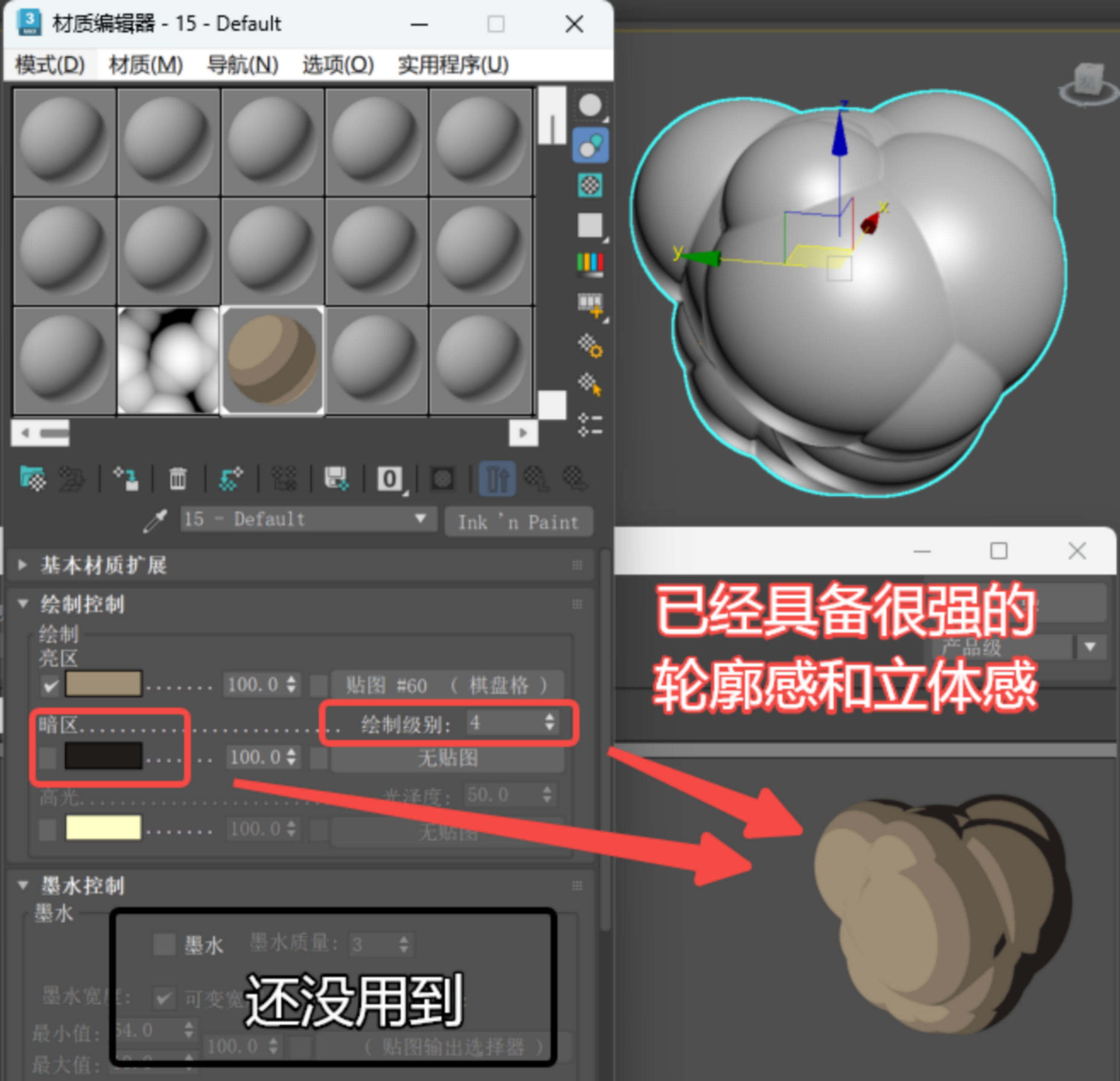 这里提醒大家,既然Ink通道如此逆天,大家务必充分利用通道的衰减(Falloff)贴图和灯光的角度。