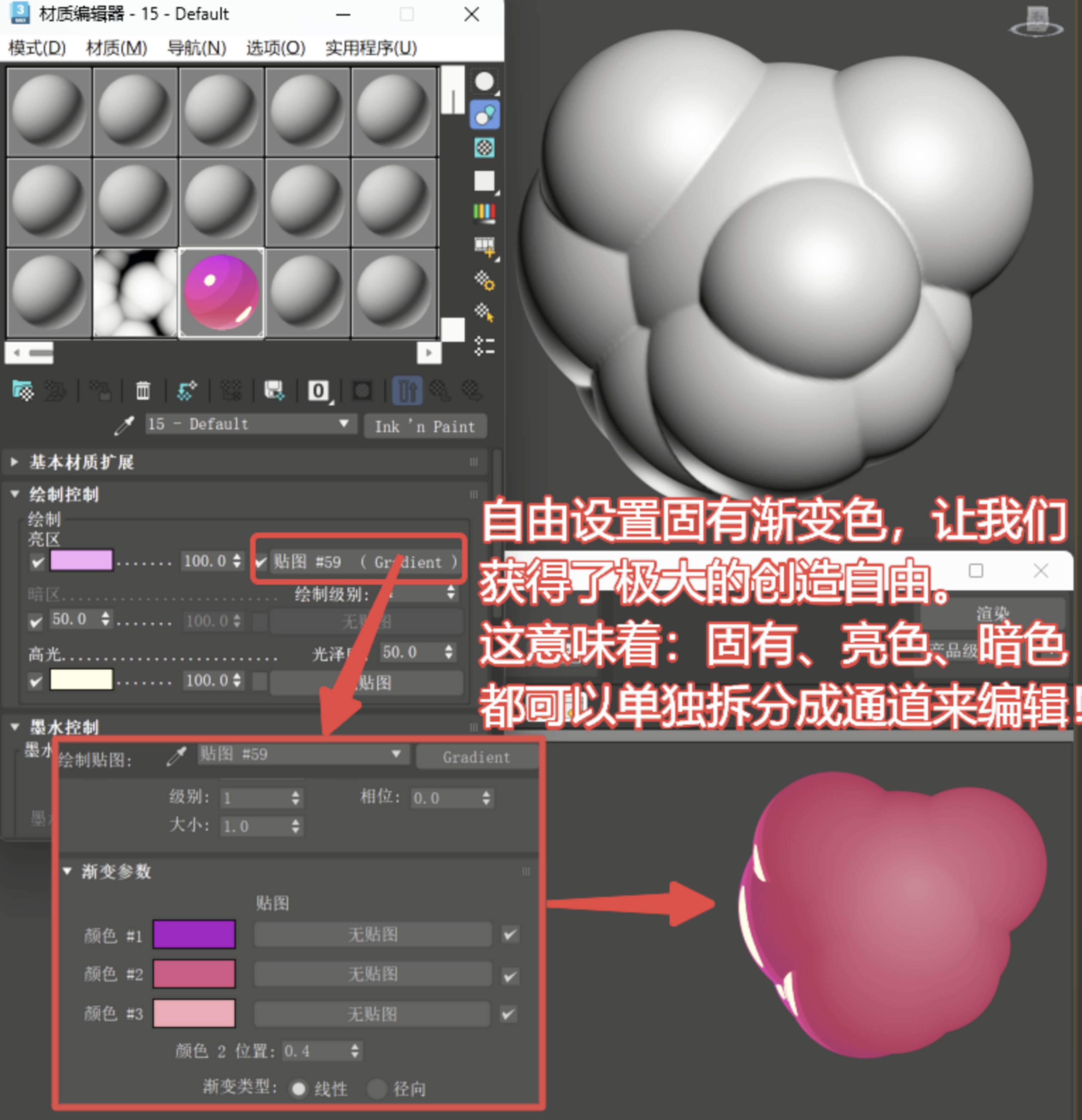 固有颜色的“亮区”“暗区”高光“”三层可以自由控制渐变颜色。。。